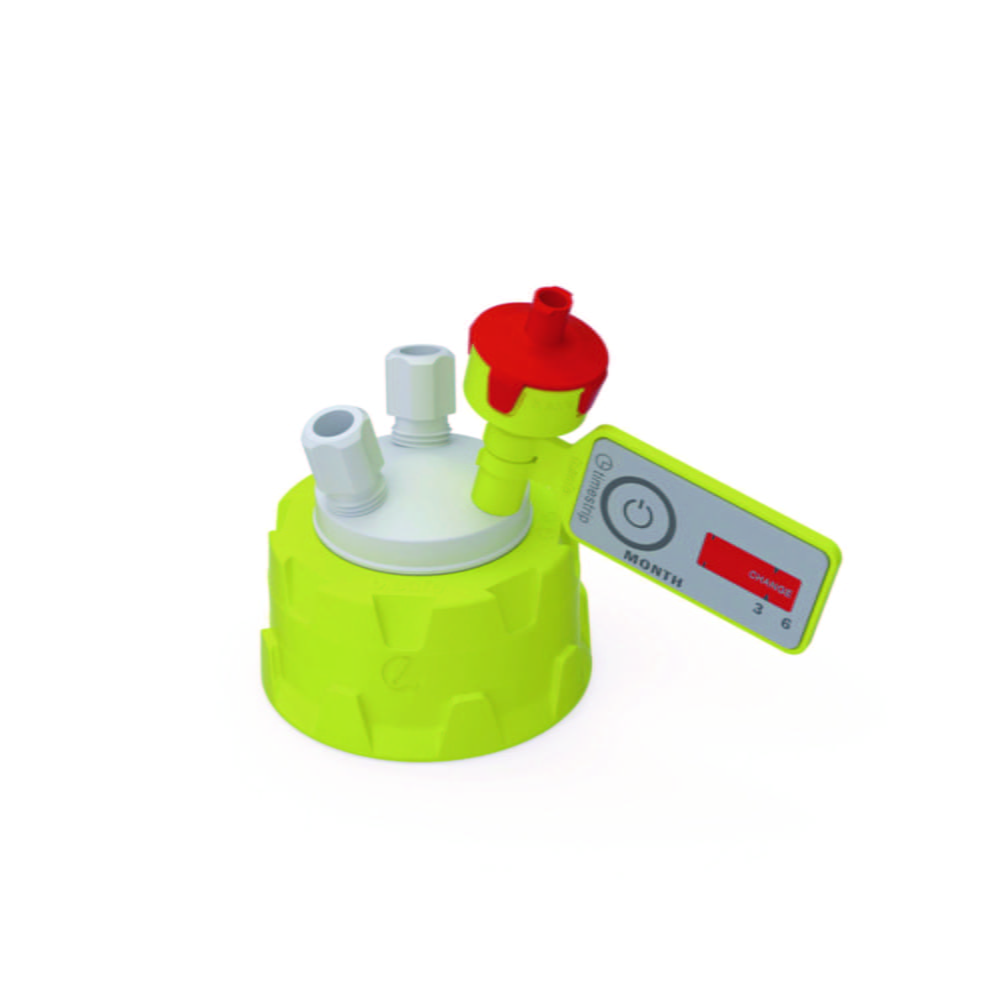 Screw caps, with freely movable insert made of PTFE. With PFA fittings for capillaries with O.D. 3,2 mm (UNF 1/4"), PTFE fittings preparative for tubing with O.D. 6,35 mm (thread NPT 1/8"), and an air valve with service life indicator.